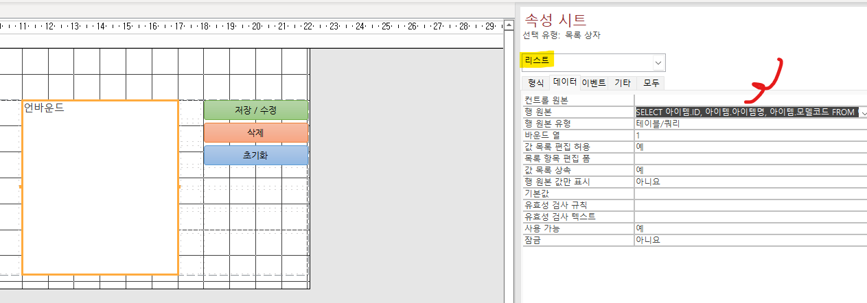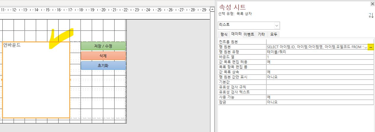 이번엔 삭제 코드를 삽입하겠습니다. 삭제 코드를 삽입하기 위해서 선행되야할것이 리스트의 afterupdate 코드삽입입니다. (리스트의 AfterUpdate 이벤트에서 정보를 가져오는 방법은 리스트에서 바로 값을 가져오는 방법과 레코드셋을 이용해서 가져오는 방법 이렇게 두가지로 번갈아 가면서 설명을 드리고 있습니다. 필요에 따라 쓰임을 적절히 배분해서 사용해보시면 좋을 듯합니다.) 이번에는 다시 레코드셋을 이용하는 방법을 사용하겠습니다.