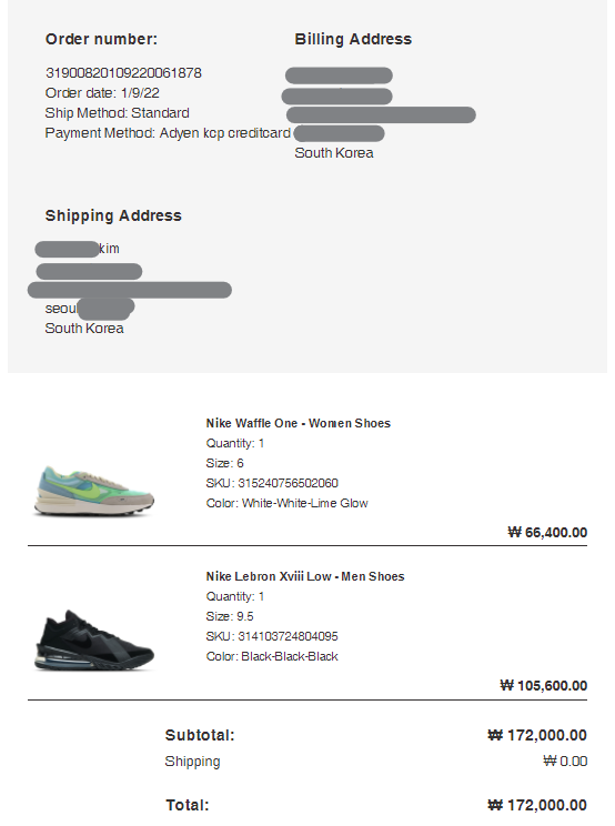 아래는 스포츠 브랜드 글로벌 체인 스토어 FoorLocker의 Order Summary입니다.