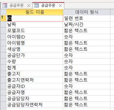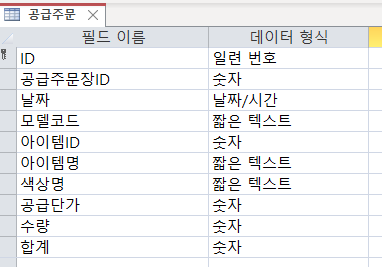 어떤 필드를 사용할지 필드를 살펴봅니다. 공급주문장이라는 테이블을 하나 더 만들어야 겠습니다.