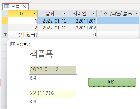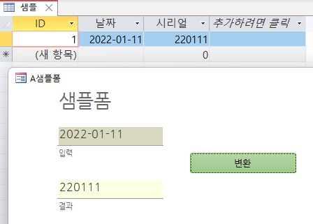 CurrentDb.Execute "insert into 샘플 (날짜,시리얼) values(#" & 입력 & "#," & 결과 & ")", dbseechanages
