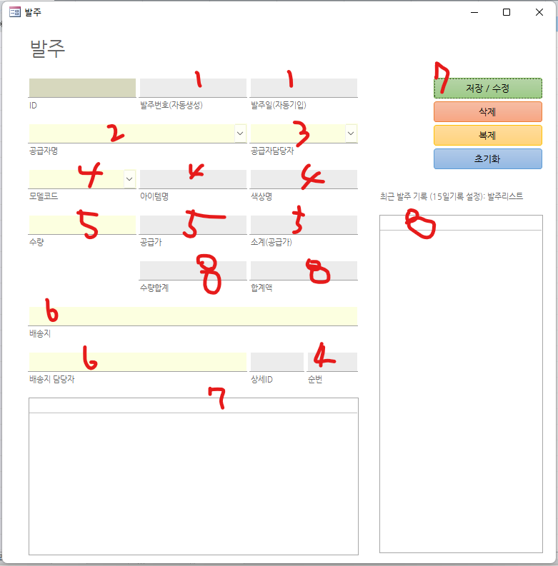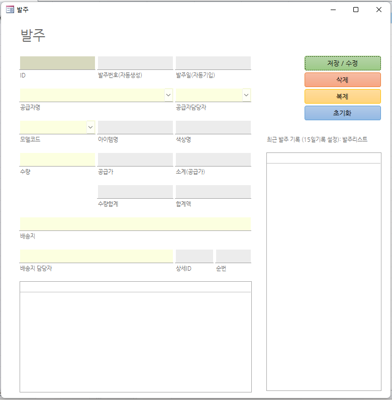 위의 코드를 넣고 폼을 닫으면 발주상세에 발주내용이 없는 발주테이블의 ID들은 삭제가 됩니다.