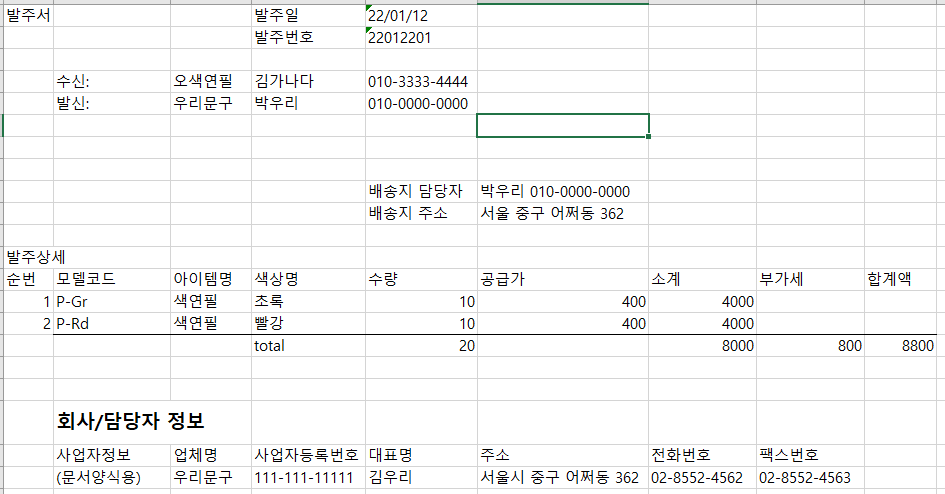 위의 나열된 필드보다 더 간단히 또는 더 많은 필드를 만들어서 코딩이 가능합니다만, 본 튜토리얼은 순전히 제 기준에서 적당한 정도를 찾아서 진행하고 있습니다. 테이블 구성은 개발자의 선택 여부에 따라 모습을 달리합니, 발주서 양식을 작성해보시고 정보를 어떻게 가지고 올 것인가에 대해서 고민해보시기 바랍니다.