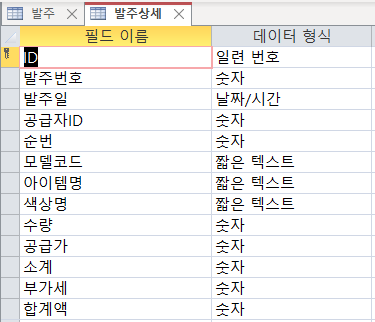 이름이 '발주' 그리고 '발주상세' 라는 테이블을 만들겠습니다.