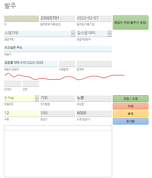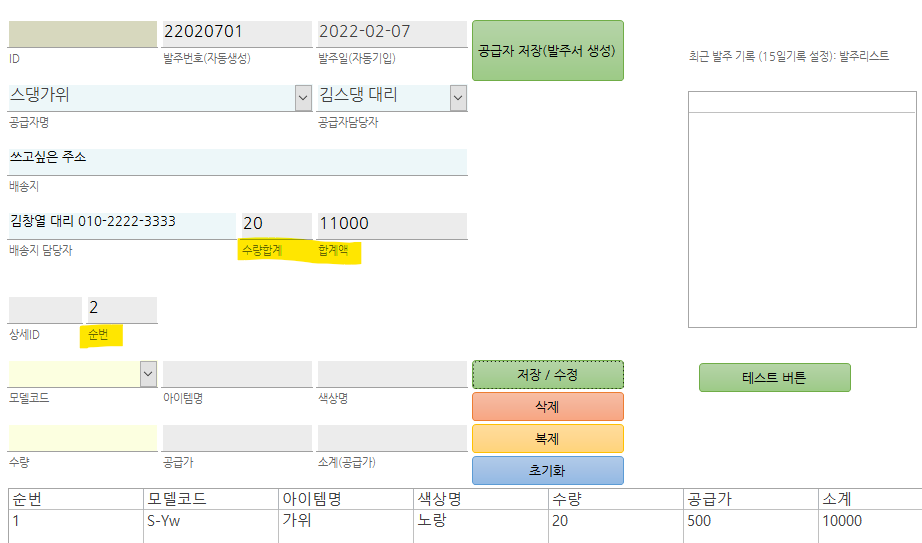 다음 글에서는 리스트 클릭후 수정과, 최근 발주기록에서 이전 기록을 가져와서 수정하는 과정으로 진행하겠습니다.