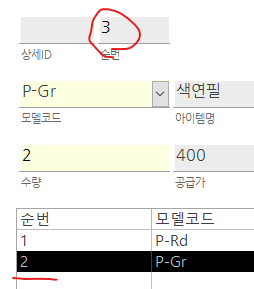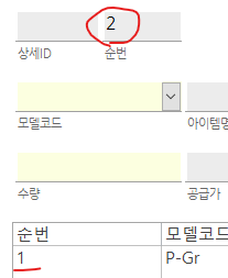 콤보상자에 걸린 rowsource의 첫행은 모델코드의 ID부분입니다. Dlookup으로 ID를 찾아서 보낸 경우입니다.