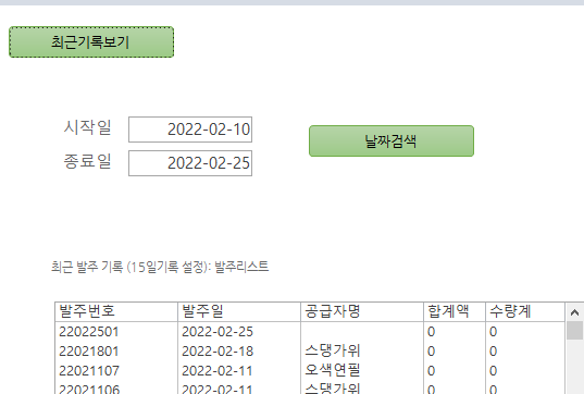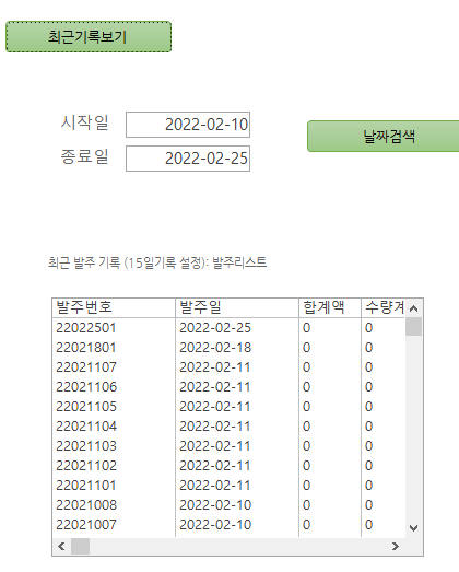 종료일과 시작일을 지정해줍니다. 그리고 버날짜검색_click() 코드를 적용하면 아래와 같이 검색 결과가 나옵니다.