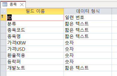 그리고 하위폼의 코드는 종목코드와 종목명에 아래와 같이 되어있습니다.