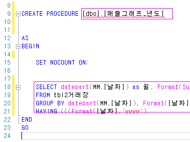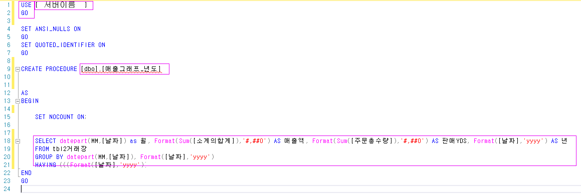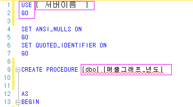 11번 줄에는 프로시져 이름을 넣는 곳입니다. 어떤 이름을 넣으셔도 동작하는데 지장없습니다. 혹시나 테이블명이나 쿼리명과 연관성때문에 걱정하시는 분들이 계실지도 몰라서 설명드립니다.