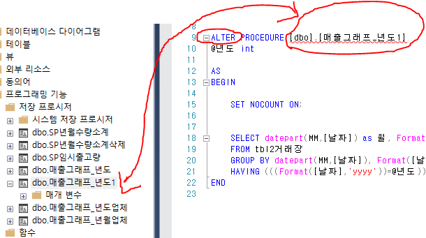 1) 프로시저 수정을 하려고 열고 싶다면, 좌측 개채탐색기에서 우클릭>수정으로 열어야 합니다.