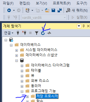 저장 프로시저 트리뷰를 닫으시고 + 표시가 되게 클릭한번 하시고