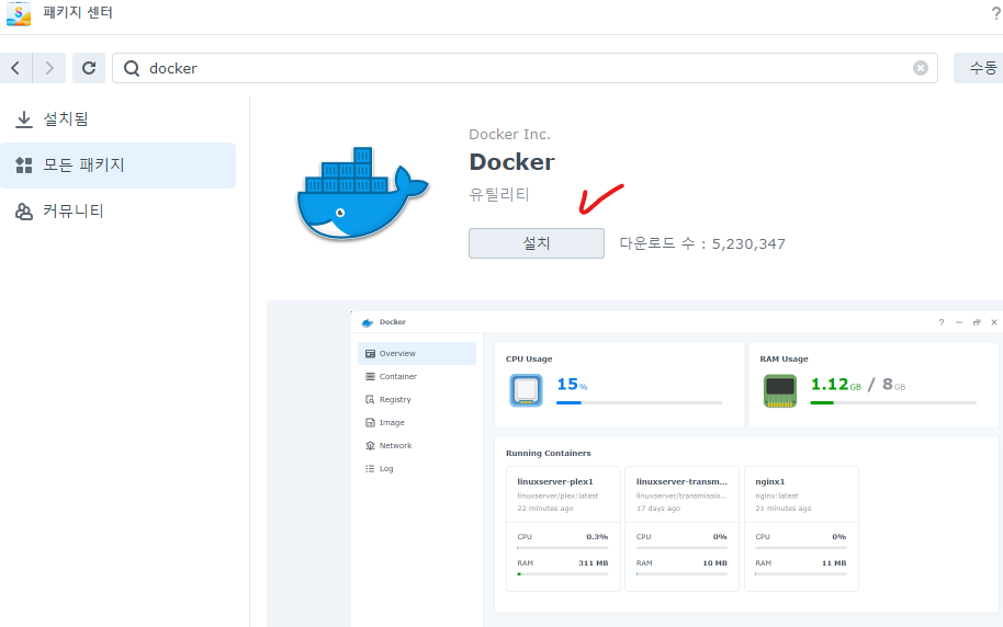 바탕화면 패키지 센터를 클릭(v표시) 해주고 돋보기 모양이 있는 검색창에 docker를 검색(2번) 해주시면 나옵니다. (3v)와 같이 클릭을 해주면 도커를 선택하게 됩니다. * (3v에서) 도커가 두개 보이는데, 위 or 아래 같은 링크 내용이니 상관없이 클릭해서 들어가시면 됩니다.