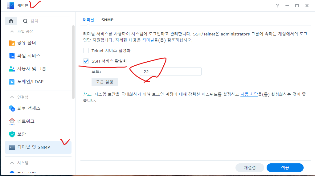 시놀로지의 제어판 설정 (제어판> 터미널 및 SNMP : SSH 서비스 활성화 포트 22