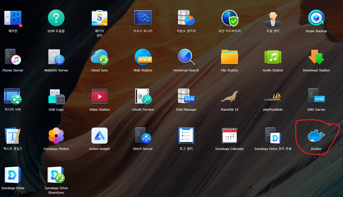 시놀로지 바탕화면에서 메인메뉴(v)를 클릭하시고