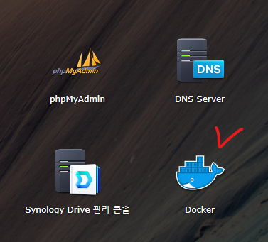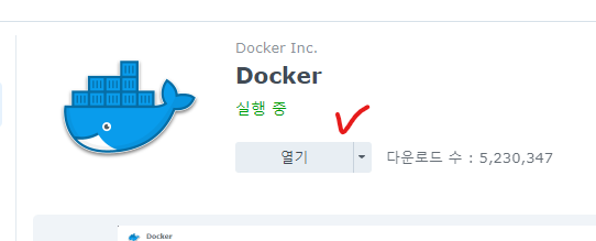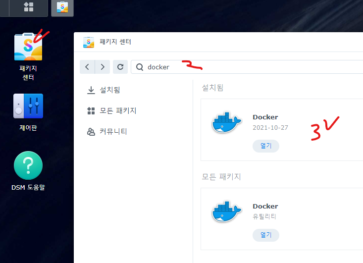 바탕화면 패키지 센터를 클릭(v표시) 해주고 돋보기 모양이 있는 검색창에 docker를 검색(2번) 해주시면 나옵니다. (3v)와 같이 클릭을 해주면 도커를 선택하게 됩니다. * (3v에서) 도커가 두개 보이는데, 위 or 아래 같은 링크 내용이니 상관없이 클릭해서 들어가시면 됩니다.