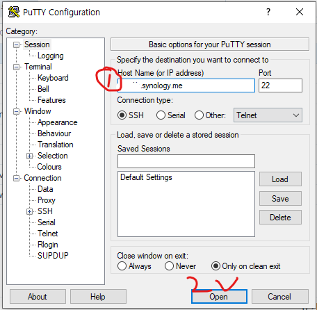 A20. (1)시놀로지 접속주소 입력 후 (2) open을 눌러주세요.