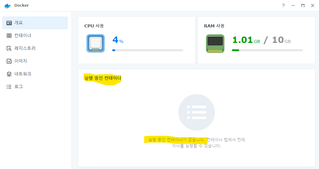 A11. 설치가 다되면, "열기"로 버튼이 바뀝니다. 열기를 눌러줍니다. 비어 있는 도커를 보실수 있습니다.