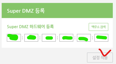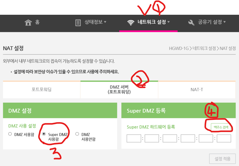 접속 이후에 (1) 네트워크 설정 > (2) DMZ 서버 > (3) SUPER DMZ 사용함 > (4) 맥주소 검색을 순서대로 클릭해줍니다.