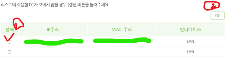 iptime주소를 선택해주시고, 갱신을 눌러줍니다.