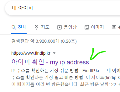 내 공인 아이피는 인터넷 주소창에 '내 ip' or '내 아이피' 만 치셔도 보실 수 있습니다.