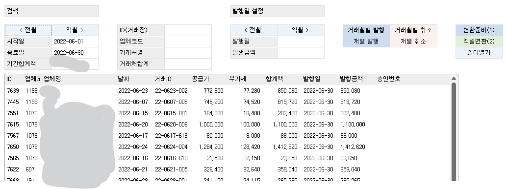 대략 월 검색을 하면 해당 발행 대상이 되는 모든 건이 출력이 됩니다.