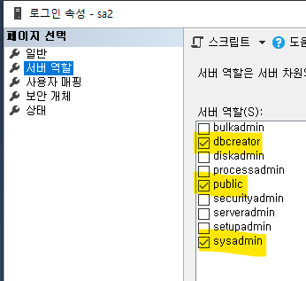 1-3. sa2의 서버역할은 3가지 dbcreater, public, systemadmin