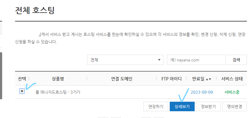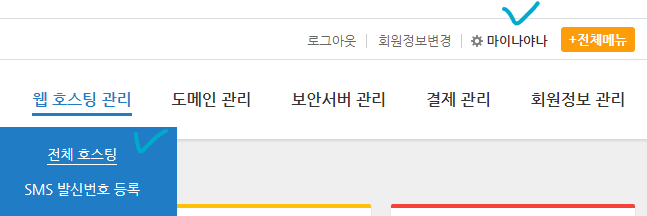 로그인후 > (우측 상단) 마이 나야나 클릭 > 웹 호스팅 관리 > 전체 호스팅 클릭