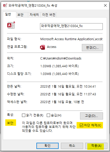 --// 2. 우측 하단의 차단 해제에 그림과 같이 체크를 넣고 '적용' 누름 이후 '확인' 누름
