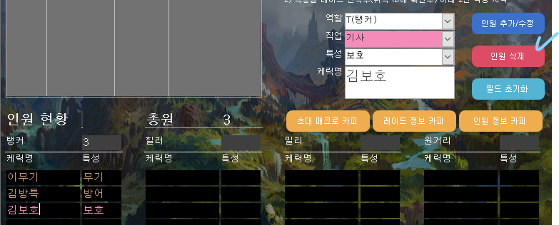 김보호를 삭제하려 한다면, 핑크색으로 된 케릭명이나 특성을 클릭해줍니다. 그러면 (#4 인원 작성부분)에 데이터가 채워집니다.
