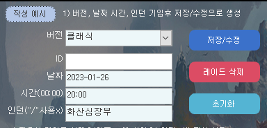 05.29.안녕하세요. 쪽지로 본섭용 만들어 달라는 요청이 많으셔서,본섭용을 만들고 클래식용도 업데이트를 했습니다.조금 달라진 부분은, 인던명을 알아서 입력하는 창이 새로 생겼습니다.첨부