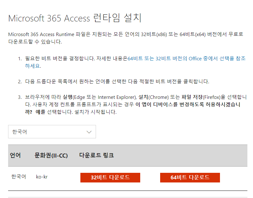 https://support.microsoft.com/ko-kr/office/microsoft-365-access-runtime-%EB%8B%A4%EC%9A%B4%EB%A1%9C%EB%93%9C-%EB%B0%8F-%EC%84%A4%EC%B9%98-185c5a32-8ba9-491e-ac76-91cbe3ea09c9
