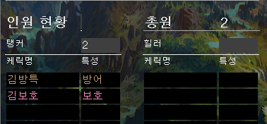 > 김맨탱(전사-방어) 김부탱(전사-방어) 박보호(기사-보호)