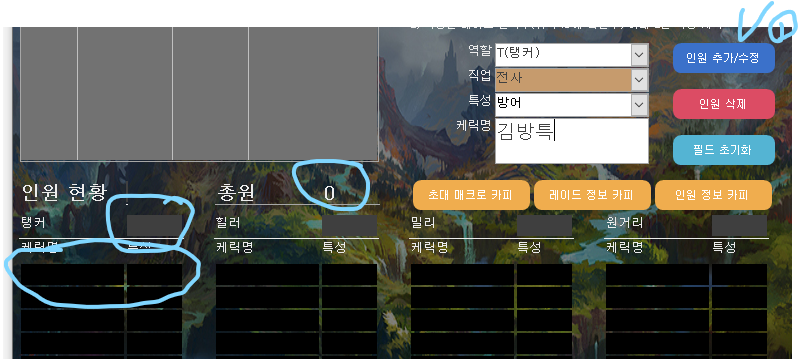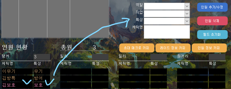 김보호를 삭제하려 한다면, 핑크색으로 된 케릭명이나 특성을 클릭해줍니다. 그러면 (#4 인원 작성부분)에 데이터가 채워집니다.