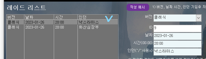 (#1) 레이드 리스트에 생성된 레이드 정보가 나타납니다.(아래 그림 참조) : 샘플파일과 모든 조건이 동일하므로, 인던을 '낙스라마스'로 변경하겠습니다.