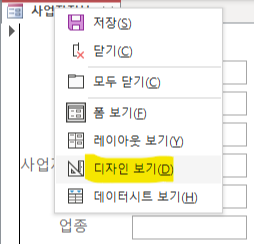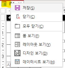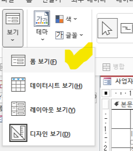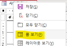 폼 보기의 다른 방법: 아래 그림은 마우스 우클릭과 다른 기능은 아니고 좌측 상단에서도 폼보기 디자인 보기등등 이용할 수 있습니다. 폼보기를 눌러줍니다.