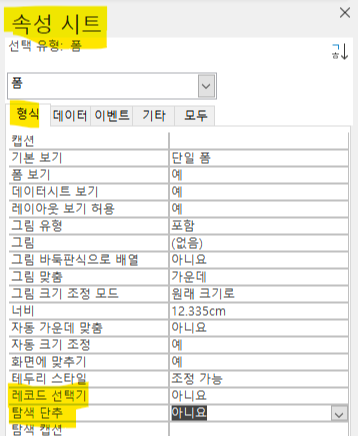2) 속성시트 > 형식 > 레코드 선택기, 탐색 단추 를 아니오로 바꿉니다.