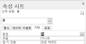 1) 속성시트 > 기타 > 팝업 을 예로 바꾸고