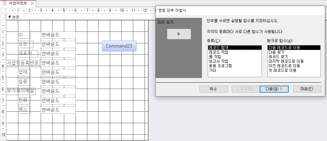 폼의 본문에 클릭 한번 하면 명령 단추 마법사 창이 뜨는데 취소 눌러주시면 됩니다.