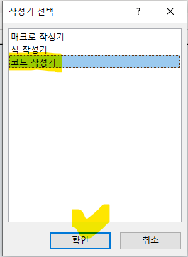 작성기 선택창이 나오면 코드작성기 선택 확인 클릭.