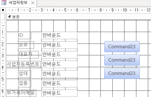 대상 버튼 클릭 > 속성시트의 이벤트의 on click에서 ... 클릭 > 작성기에서 코드 작성기 선택후 확인 의 반복