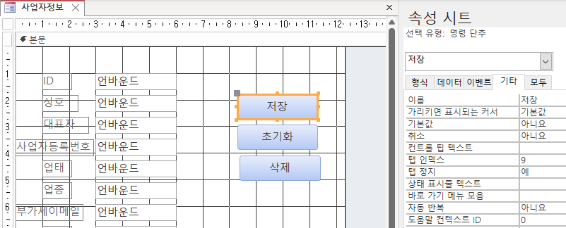 아래 콤보상자 부분에 노란색 친 부분에 '저장'이라고 나오는데, 내가 '저장'이라는 이름의 컨트롤을 선택했다는 의미 입니다.