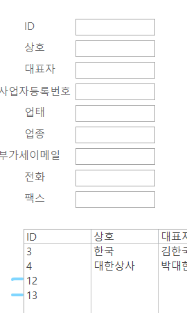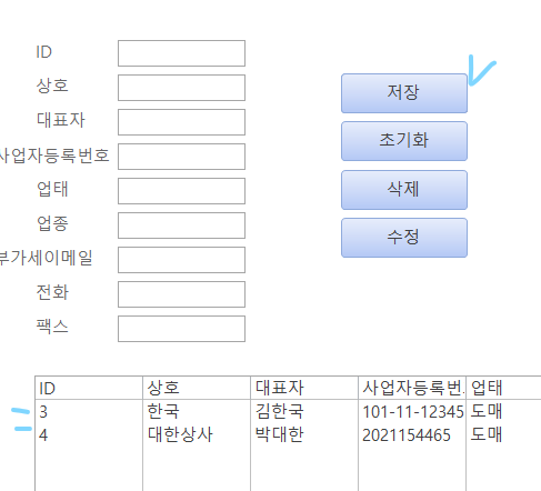 ",업태 = '" & 업태 & "',업종 = '" & 업종 & "',부가세이메일 = '" & 부가세이메일 & "',전화 = '" & 전화 & "',팩스 = '" & 팩스 & "' where id = " & ID & " ", dbSeeChanges