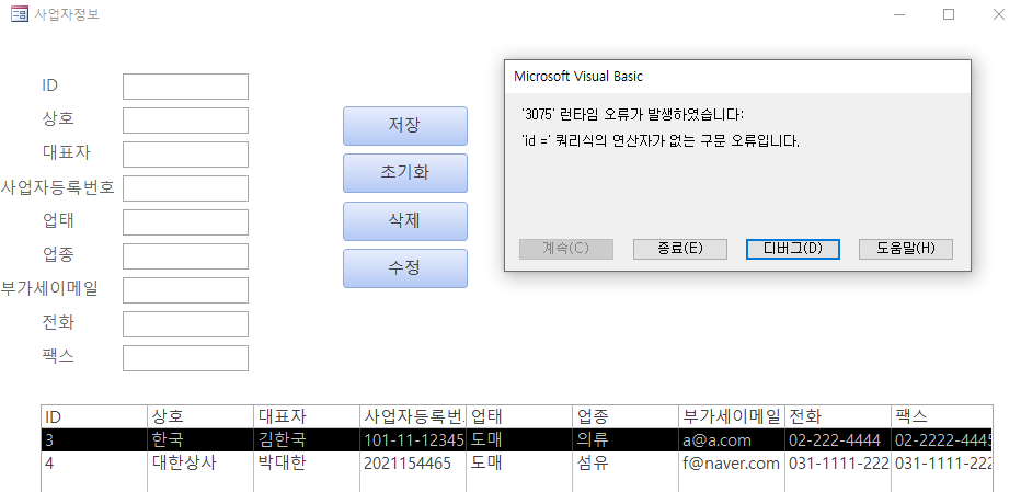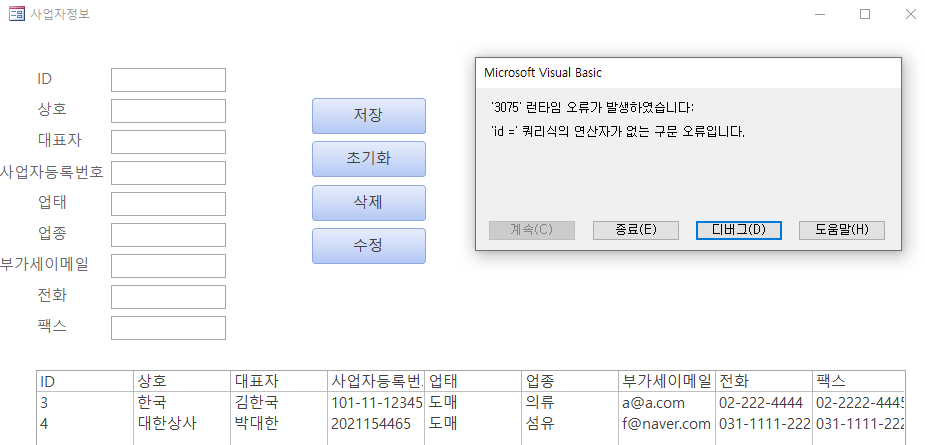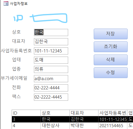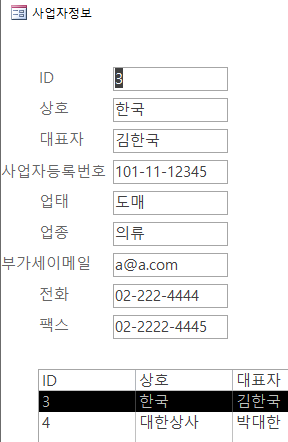 CurrentDb.Execute "update t사업자정보 set 상호 = '" & 상호 & "',대표자 = '" & 대표자 & "',사업자등록번호 = '" & 사업자등록번호 & "' " & _