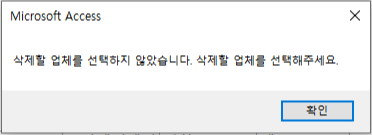 MsgBox "삭제할 업체를 선택하지 않았습니다. 삭제할 업체를 선택해주세요."