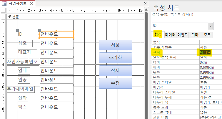 - 첫번째 방법은 속성시트 > 형식 > 표시 를 '아니오'로 만들어주면 됩니다.