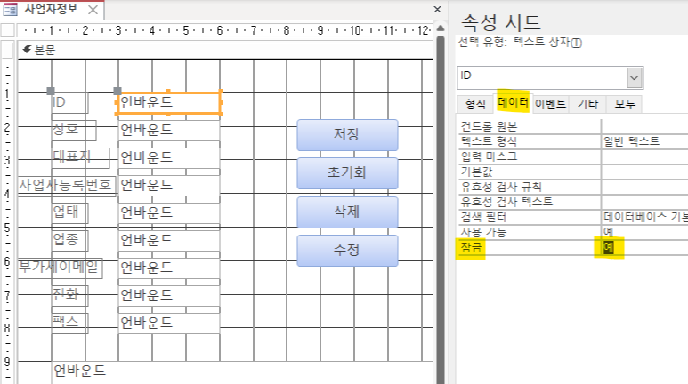 - 두번째 방법은 속성시트 > 데이터 > 잠금 을 '예'로 만들어주면 됩니다.