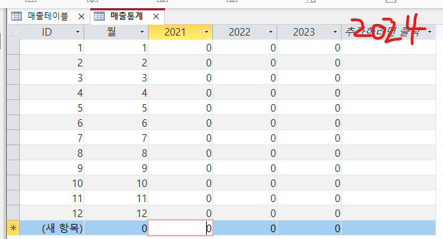 * 가장 중요한 조건은 내가 23년까지 통계 필드가 있는데 지금 24년인지 어떻게 아느냐 인데, 그 조건을 매출테이블에 24년이 있고, 통계테이블에 24년이 없다면 24년을 넣겠다라는 내용입니다.