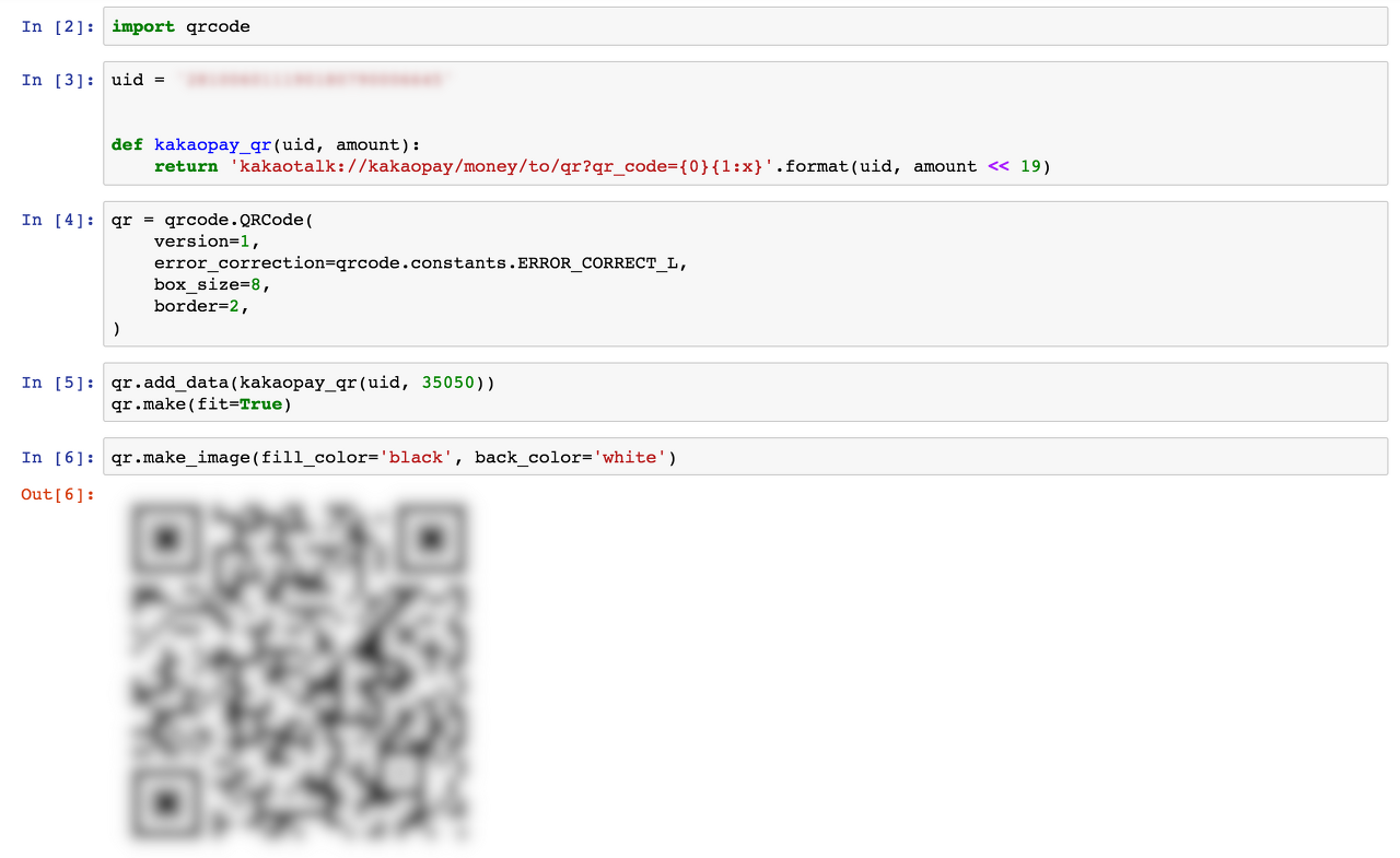 사용자가 입력한 금액에 따라서 이 URL을 생성하고, 그것을 QR 코드로 만들면 되는 아주 간단한 작업이다. 나는 명령창 환경이 편하기 때문에 대부분의 작업은 vim 에디터를 띄워서 하는 편이지만, 화면에 무언가 보여줄 것이 있을 때에는 주피터 노트북을 이용해서 편하게 프로토타이핑을 할 수 있다. QR 코드 생성은 파이썬의 qrcode 패키지의 도움을 받았다.