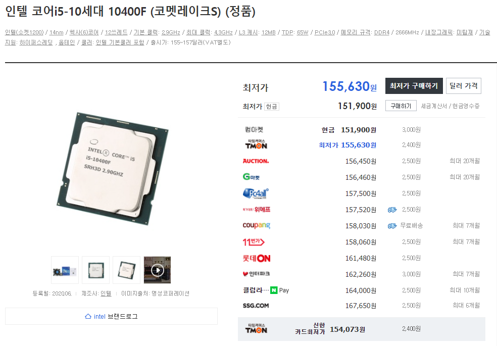 [다나와] 인텔 코어i5-10세대 10400F (코멧레이크S) (정품)