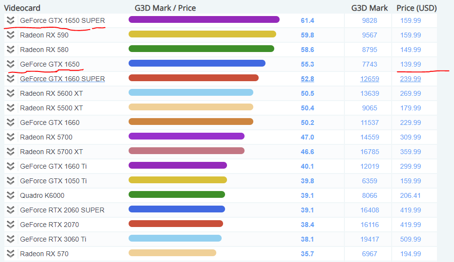 Videocard performance / price value chart for Videocards for sale. Updated daily.