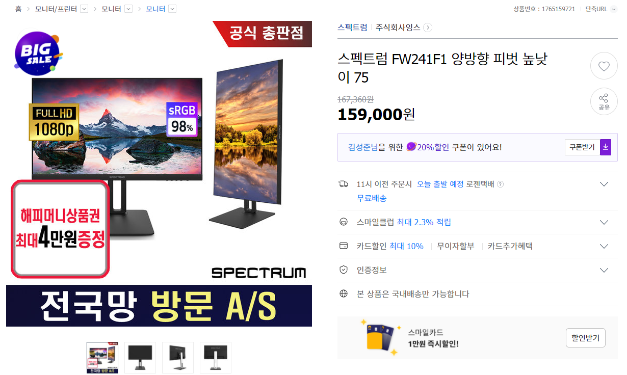 보시면 아시겠지만 지마켓 20% 스마일 할인 받아서 언더 14만원에 24인치 모니터를 구입했습니다.